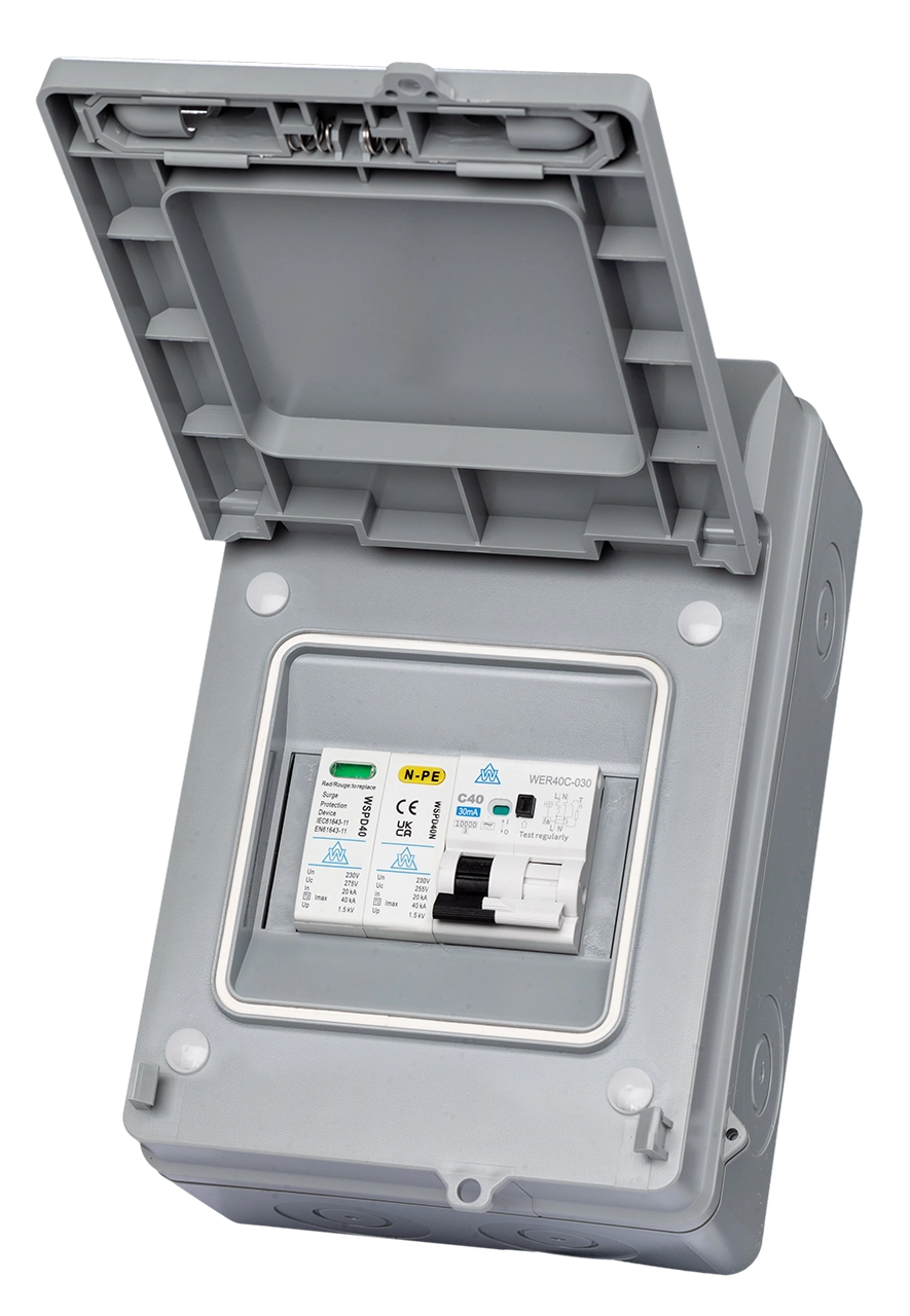 Featuring a 32A or 40A RCBO and an integrated Type 2 Surge Protection Device (SPD), this enclosure provides comprehensive protection against overcurrent, residual current, and transient overvoltage — all housed in a durable IP65-rated plastic enclosure ideal for outdoor use.