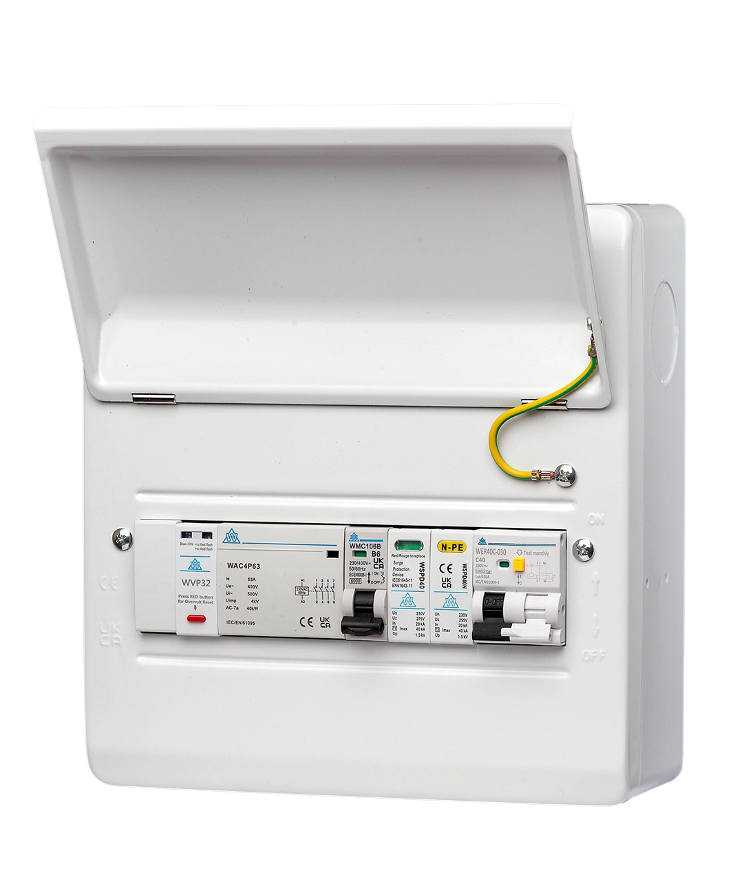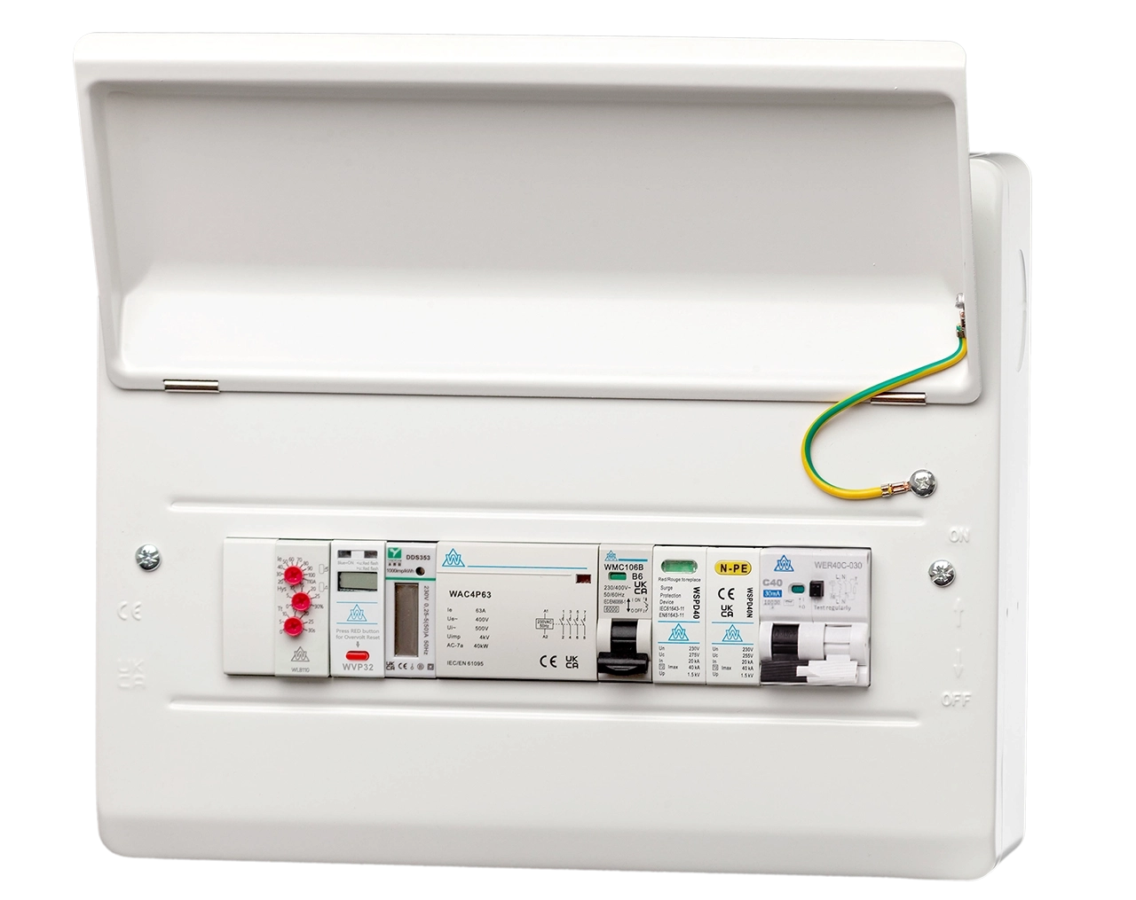 WCED Fitted Consumer Unit IP40 - PME + 40A RCBO (Surge Protection + Kwh meter + Load Balancing Options available)