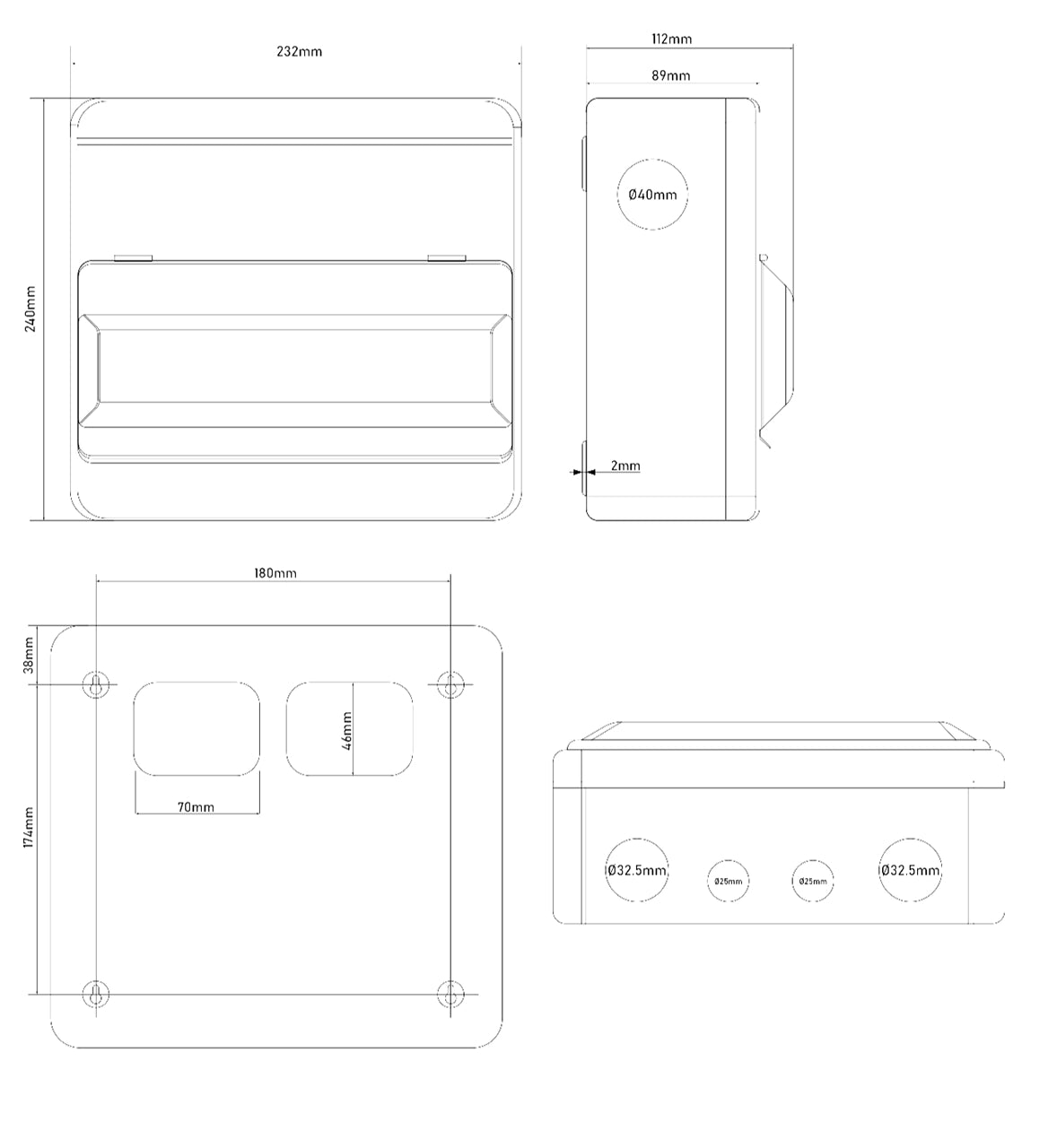 | Cable Knock-outs | 25 mm, 32 mm (top & bottom), 40 mm (sides/back), plus larger rear slots |